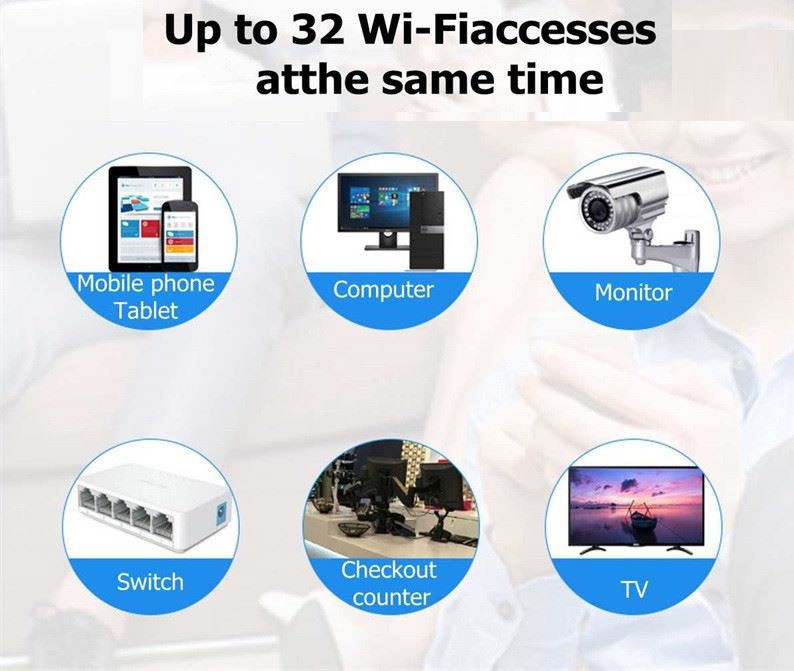 Fino a 32 accessi WiFi contemporaneamente. Mentre il router 4G trasmette WiFi, può anche collegare computer, monitor, interruttori, registratori di cassa, televisori e altre apparecchiature con cavi di rete allo stesso tempo.